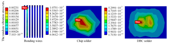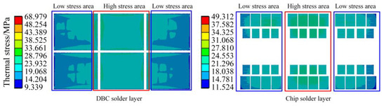 It can be seen that the maximum thermal stress of the DBC solder layer is 68.979 MPa, and the maximum stress of the chip solder layer is 49.312 MPa in Figure 14. As the location where the maximum stress value is located is most likely to cause fatigue failure compared to other locations, the authors have divided the high stress area and low stress area in Figure 14. The location of the maximum stress is in the high stress area, where the stress is relatively large and fatigue failure is more likely to occur. It can be seen from Figure 14 that the high stress areas of DBC solder layer and chip solder layer are concentrated in the middle of the whole module.