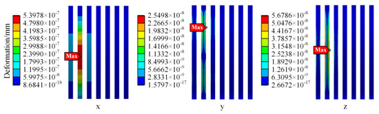 In Table 5, the vibration modes of the first six orders are respectively translational along the x, y, and z axes and rotational around the x, y, and z axes. The vibration modes of the seventh to eleventh orders are respectively “∞” vibration along the Y axis, vertical bending along the Y axis, vertical bending along the X axis, “∞” vibration along the X axis, and wavy vibration.