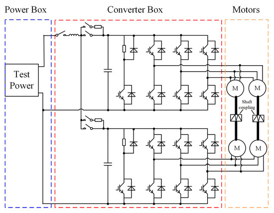 In order to verify the validity of the established finite element model (FEM) thermal simulation results, an experiment platform was established, as shown in Figure 20 and Figure 21. The platform mainly consists of a traction converter (DC-link capacitor, inverter circuit, and braking circuit, et al.), traction control unit (TCU), traction motors, and a cooling system. The platform parameters are illustrated in Table 7.