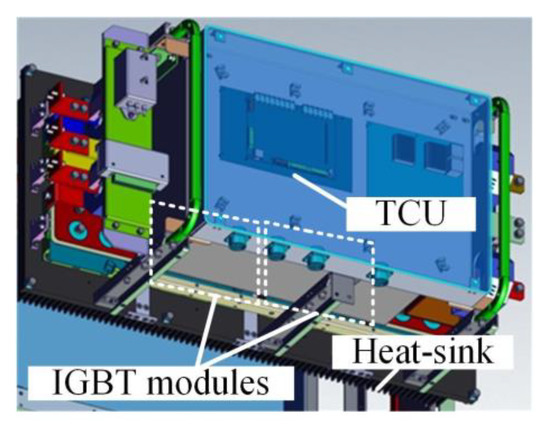 The traction converter in Figure 21 is used to control the traction motors according to the speed and load profile in the metro plan map of a line in S city, China. Considering that six IGBT modules in the traction converter mentioned in our previous study [31] are compact, fixed on the heat-sink and the TCU, sensor, and other devices are installed in front of the IGBT modules, as shown in Figure 22, it is difficult to measure the chip junction temperature inside the IGBT module. In practical applications, the IGBT module is mechanically fixed on the heat-sink to increase the heat dissipation efficiency [32]. The heat conduction path of the chip in the module is shown in Figure 23. The heat is eventually transmitted to the heat-sink, so the temperature of the heat-sink depends on the temperature of the chip, which can indirectly reflect the change in the chip temperature to a certain extent. Therefore, considering the actual test conditions of temperature measurement and better reflecting the thermal effect brought by the IGBT module, the temperature measurement point is chosen to be located in the middle of the two IGBT modules on the heat-sink, corresponding to pointA in Figure 11.