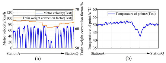 In order to simulate the actual train situation, the test was conducted according to the operation planning and load situation, and the test waveform diagram was selected to simulate StationA to StationQ. The typical train speed situation and the percentage change in train equivalent load during the test are shown in Figure 24a.