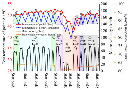 The corresponding temperature change in heat-sink pointA during operation is shown in Figure 24b. It can be seen that the temperature of the heat-sink pointA fluctuates at about 51 °C during high-speed operation with passengers. However, the temperature drops very quickly during the terminal and departure stations (StationJ–StaitonL) because the speed and load are the lowest.
