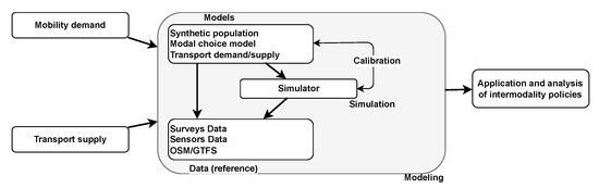 Therefore, it is essential to think carefully about decisions to promote this practice. To evaluate their policies, mobility and transport stakeholders often use software for traffic simulations [6]. Different levels of modeling depend on the degree of granularity that is possible: macroscopic [7], mesoscopic [8], or microscopic [9,10]. A simplified vision of these viewpoints could be translated into two main families for transportation simulations: flow-based or agent-based models. In a flow-based model, each moving entity is seen as a physical particle in a flow or a force field. This modeling is particularly relevant for studying the traffic flow on a highway or the size of a public transport line. Physical constraints (e.g., minimum distance or dynamics based on velocities and accelerations) take precedence over decision-making aspects. The other point of view considers that the decisions result from the cognitive processes of the different active entities (called agents). The agent perceives and acts on the environment according to its knowledge and preferences. Thus, it can be based on mobility simulation tools and, in particular, agent-based approaches [11], which are well-suited to the complex nature of transport systems [9]. This approach, called the agent-based model (ABM), describes a system as a set of agents interacting with each other. The ABM is particularly distinguished by the study of the decision-making processes underlying the behaviors, because there is a natural relation between the individuals (from a transportation system) and the agents (from our model). To our knowledge, the inter-modal behaviors within these tools are not very well defined or are even missing [12,13].