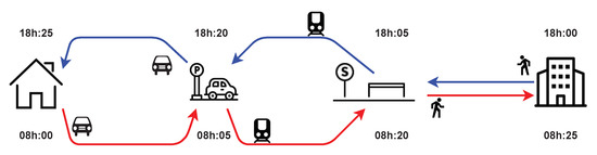 We propose two new complementary transportation modes: (1) car_pt for the outward journey and (2) pt_car for the return journey. The car_pt alternative (shown in red) is defined by a private vehicle (as the transportation mode) from the home to the PR (first trip) facility. The second trip is performed by the PT mode (e.g., bus or subway) from the PR to the destination, or more precisely to the nearest station, followed by an egress of walking. The same process is performed for the return trip, using the alternative called pt_car (blue). In this case, the first trip is made by public transport from the previous destination to the same parking facility used for the outward journey. In the second trip, the individual returns home using the same vehicle left at this parking facility.