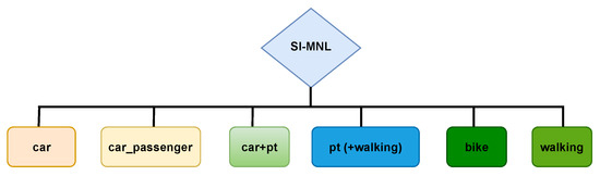 The MNL is justified by the simplicity of their set-up [34,40]. These models are based on an essential property, namely the Independence of Irrelevant Alternatives (IIA, a property of independence with respect to the other alternatives). Therefore, we suppose that the modal choices are independent, and the error terms are without correlations. The hierarchical structure of the model is presented in Figure 4. All the modes are at the same level of consideration. The utility function (Equation (1)) representing the inter-modal alternative is based on the PV and PT functions (Equations (2) and (3), respectively):