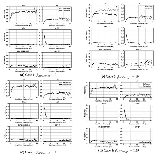 The modal shares for each mode (alternative) are presented on the ordinate axis, while the Euclidean trip distances are on the abscissa. This representation allows a better appreciation of the modal distributions. For example, we can see that the walking share was very large for short distances and close to zero for long distances, corresponding to our intuition. Case 4 (selected for the following results), with (Figure 5d), produced a simulation output similar to the reference situation. There were some differences for long trips (more than 12 km) realized by PV, PT, and PVPT. This difference was mainly due to the lack of baseline observations of these types of trips, which were, in our context, mostly occasional.