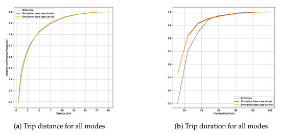 Distribution of trip distances and durations for all modes from simulation and reference.