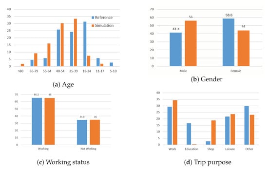The majority of the PVPT users from the simulation and observed data were between 18 and 54 years old. This result is consistent with the age required to obtain a driver’s license and acquire a car. However, the simulation failed to reproduce the people aged between 18 and 24 years old well. This use rate of the PVPT alternative is mainly explained by the low motorization (car ownership) for this category of agents in the synthetic population. Contrary to the reference situation, the simulation showed that men used the inter-modality more than women. In terms of professional status, the results of the simulation matched perfectly with the reference data. Workers practiced the inter-modality more. This result can be explained by the professional trips from the peripheral areas (characterized by car ownership) toward Lille (the main activity area) in particular. We also note a good result concerning the trip purposes: work, leisure, and other (e.g., visits). The educational motivation did not really give the desired result in the simulation, while that for shopping was overestimated. This was also justified by the motorized observations of the 18–24 year old group in the simulation.