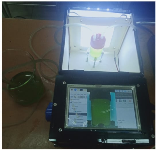 With the expectation that the proposed estimation framework can be widely implemented in practice, a low-cost microalgae monitoring system was developed. The premise behind the monitoring system is that the microalgae solution is slowly and continuously pumped from a cultivation tank into a sample container and then refluxed back to the tank. The sample container is transparent and located in a dark box. A low-cost Raspberry Pi camera was deployed on a wall of the box to take photos of the sample container. Due to the transparency of the container, the captured images present information of microalgae. It is noted that, for the photography in the dark box, an artificial light was generated. Using the artificial light aims to eliminate any disturbances caused by uncertain natural light, which guarantees the best quality of the captured images. Since the sensing devices do not destruct the microalgae structure, the monitoring system is non-invasive and biosecure, which differs from some invasive techniques that include the dry cell weight []. Furthermore, the system can provide continuous monitoring over time without disturbing the growth of microalgae. The microalgae monitoring system in a working state is demonstrated in Figure 2. The development of the system cost approximately USD 150. For more details of this sensing system, interested readers are referred to our previous work [].