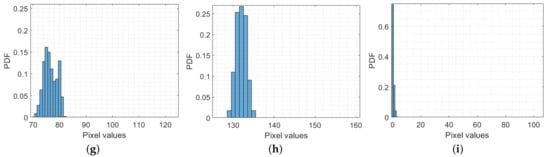 Distributions of the pixel values in color channels of the cropped images of Figure 1a (first row), Figure 1b (second row), and Figure 1c (last row), respectively. (a) Red channel of Figure 1a; (b) green channel of Figure 1a; (c) blue channel of Figure 1a; (d) red channel of Figure 1b; (e) green channel of Figure 1b; (f) blue channel of Figure 1b; (g) red channel of Figure 1c; (h) green channel of Figure 1c; (i) blue channel of Figure 1c.