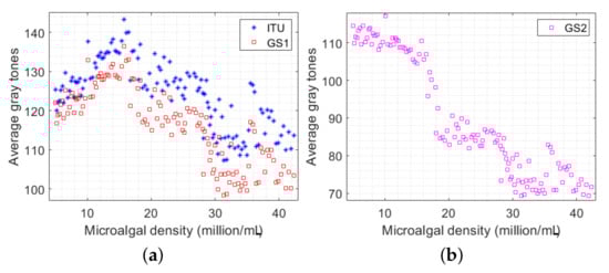 Grayscale average values of the microalgal images versus their corresponding densities, where the gray tones are converted based on (a) ITU [,] and GS1 [] criteria and (b) GS2 [] criterion.