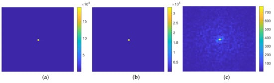 We implemented the spatial frequency technique in our dataset, and, as an example, the power spectra of three color channels of the image as demonstrated in Figure 1c are illustrated in Figure 6. As can be seen in Figure 4g–i, since the distribution range of pixel values in each color channel is different, the corresponding power spectra in Figure 6 are also different. Therefore, we propose to form three spatial frequency features in each microalgae image by computing average values of three corresponding power spectra, which are called , , and .