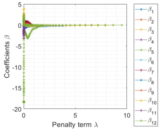 However, due to the complexity of the dataset, the least square technique may cause under-fitting or over-fitting problems [], which leads to inaccuracy in the prediction. Therefore, in this work, we propose to employ an L1-regularization-based approach called least absolute shrinkage and selection operator (LASSO) [,] to optimally estimate the coefficients . Fundamentally, regularization can help a regression model to avoid the over-fitting of data [].