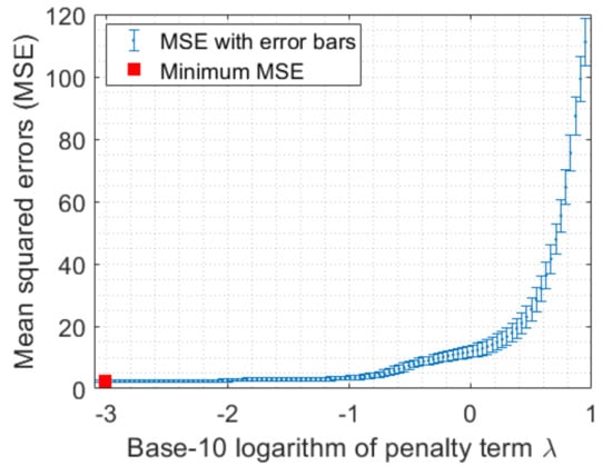 Given the example illustrated in Figure 7, we now investigate what value we should use for the penalty term . In order to automatically identify the best value for given the dataset, we propose to exploit the k-fold cross-validation technique []. For instance, one can set to one of 100 values ranging from 0 to 10. For each value, it runs the k-fold cross-validation algorithm in the given dataset, where, at each iteration, the optimization (8) is solved. A mean of squared errors (MSE) or cross-validated squared residuals over k folds can also be calculated. After running all possible values of , the best penalty term is selected by the corresponding minimum MSE. As a demonstration, we implemented this learning technique in our dataset with 12 aforementioned features, in which, we chose . The obtained MSE results with error bars are depicted in Figure 8, where the minimum MSE is highlighted by a red square, which corresponds to the selected .