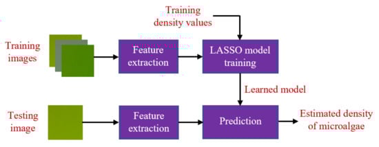 On the other hand, since the relationship between the image features and microalgal densities can be linear or nonlinear, we propose to exploit an L1-regularization-based approach called least absolute shrinkage and selection operator (LASSO) [,] as a regression model. Fundamentally, regularization can help a regression model avoid the over-fitting of data []. Furthermore, coefficients of the features in the model can be optimized in a way that prefers the more informative features, which results in a well-fit model to the data. Eventually, the microalgal density can be more accurately estimated. In order to evaluate the effectiveness of the proposed approach, we implemented it in a dataset collected by a sensing system [] monitoring the Chlorella vulgaris microalgae strain. The obtained results demonstrate the outperformance of the proposed method compared with several existing methods.