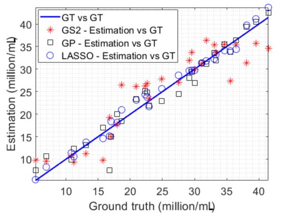 Let us consider one example of the training and testing data sets, where 100 image samples and 100 ground truth (GT) values of microalgal density in the training data were utilized to train three models including LASSO, GP and GS2. Given 29 images in the testing data, the trained models were then employ to estimate densities of the corresponding microalgae. The estimation results are compared with the GT in the testing data, as demonstrated in Figure 10. In an ideal case of absolutely accurate estimation, the estimation results should lie on the GT line (e.g., the blue line in Figure 10). In other words, if the estimated density values stay further from the GT line, the estimation method is less accurate. As can be seen in Figure 10, the proposed LASSO approach outperforms both the GP and GS2-based algorithms in the example.