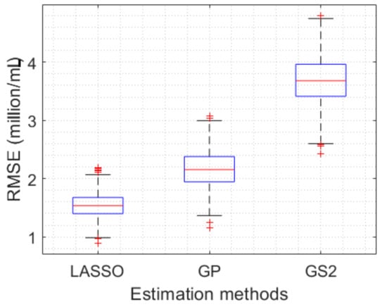 In order to statistically conclude the outperformance of the LASSO estimation method, we repeated the implementation of three techniques 1000 times, where, in each implementation, the training and testing data sets were randomly selected. RMSEs between the estimated density results and the GT in the corresponding testing data set were also computed in 1000 implementations. The RMSEs results obtained by three methods are summarized by boxplots as illustrated in Figure 11. It can be clearly seen that the results obtained by the LASSO approach are more accurate than those obtained by the GP and GS2 techniques. More specifically, the mean and interquartile range of the estimation RMSEs in the LASSO implementations are 1.54 and 0.28, whereas those in the GP and GS2 experiments are 2.16 and 0.43, and 3.68 and 0.55, respectively.