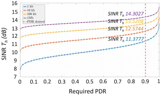 where Q−1 is the inverse Q function. Therefore, based on Equation (6), the relationship between SINRth and PDR can be illustrated. Figure 2 illustrates this dependency for several packet sizes. As one can see, the SINR threshold increases considerably as the PDR threshold increases, reaching 11.37, 12.57, 13.52, and 14.30 dB for a PDR requirement of 90% for a 1, 10, 100 kb and 1 Mb of payload, respectively. Therefore, these results emphasize the high impact of SINR on the PDR. As MUI definitely impacts the SINR, one can connect the MUI with the overall PDR performances.