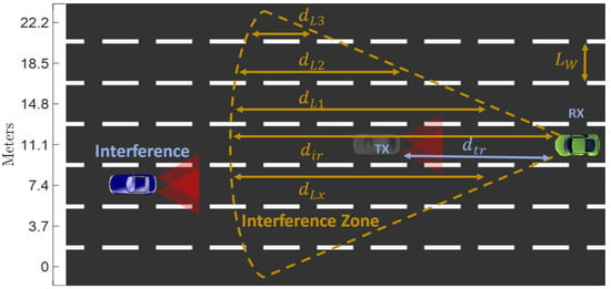 After the required SINR threshold has been determined, the next step of the analytical determination of the interference effect focuses on establishing the geographical area from which generated interference could affect V2V VLC links. The envisioned communication scenario is illustrated in Figure 3. Although the real-life traffic scenario assumes bidirectional communications involving a VLC tail-lights transmitter and VLC headlight transmitter, these simulations will analyze the most unfavorable situation, which is the case when the tail-light VLC transmitter is used. Here, dtr is defined as the distance between the intended transmitter (Tx) and the intended receiver (Rx), dLx denotes the longitudinal distance within the MUI area for each lane, whereas LW defines the width of the lanes. For this purpose, the distance between an interfering node and the intended receiver (dir) that respects the conditions defined in Equation (7) should be determined.
