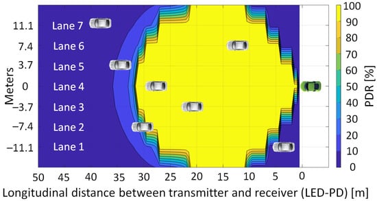 Geographical distribution of the packet delivery ratio for a V2V VLC link when transmitter (white vehicle) and receiver (green vehicle) are on a seven-lane road segment and no interference sources are within the area.