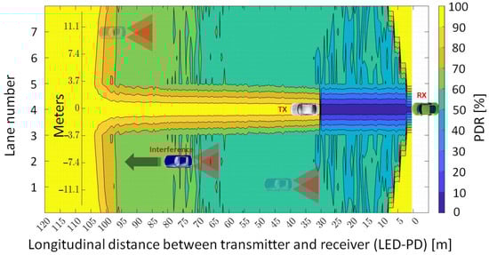 Next, in order to have the reference values that are required to make an adequate comparison, the PDR for a V2V VLC link has been assessed, in the absence of any interfering nodes. The simulations are made assuming a seven-lane straight road, with the RX located in the middle lane (lane 4), whereas the intended TX is placed along all the scenarios lane by lane. The acquired findings are shown in Figure 4, where the horizontal and vertical axes denote the longitudinal (i.e., distance from the receiver) and lateral (i.e., lane number) locations of TX, respectively. Therefore, Figure 4 illustrates the achieved PDR result for each TX location. As expected, the longest communication range is achieved when the transmitter and receiver are located on the same lane (i.e., the lateral distance is 0 m). In such conditions, a PDR higher than 90% is attained up to 32 m of longitudinal distance. In the case that the transmitter is located on the adjacent lanes to the right or left, more than 90 percent of PDR can be achieved between 2 and 31 m of longitudinal distance. Next, when the transmitter is found on a second adjacent lane, a PDR higher than 90 percent can be achieved within the 5 to 30 m longitudinal distances. Lastly, a PDR above the 90 percent target is achieved for 8 to 27 m when the transmitter is on the third adjacent lane. These results reflect the limitations imposed by the mandatory LoS condition associated with VLC, and also indicate a rather wide area where the PDR can be maintained within the platooning requirements limits.