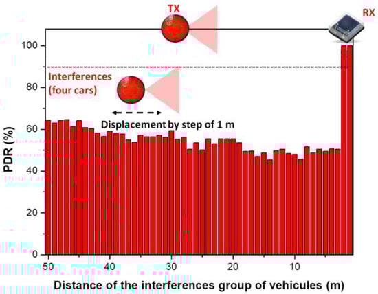 As previously mentioned, the 30 m TX − RX VLC distance was considered as this distance is close to the communication limit considered for this scenario, as shown in Section 2.2. Next, in order to evaluate the effect of the four interference vehicles on an improved SINR link, the TX − RX VLC distance was reduced from 30 to 20 m, and the simulation process has been started again. The results for this case are illustrated in Figure 7 and they show that when the four interference vehicles are no more than 10 m away, the effect on the PDR ratio is still rather low, at 50% values. Nevertheless, as the interference vehicles are getting further, the PDR is gradually improving, re-entering in the 90% target after the interference vehicles get more than 37 m away.