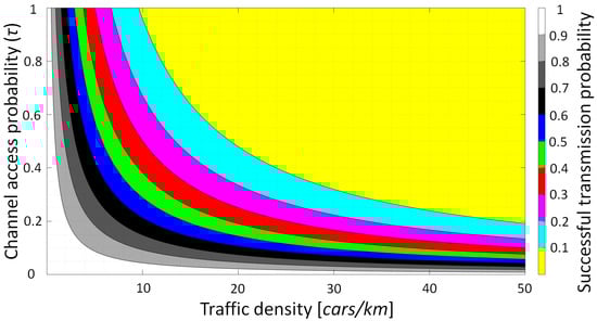 The channel access probability of each vehicle is symbolized by τ, and it is established by supposing that vehicles produce messages on a regular basis and using Ttx as the average packet transmission time. Consequently, τ can be determined based on Equation (12).