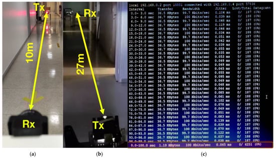 Experimental setup showing the VLC system communication range and communication parameters: (a) setup with a vehicle tail-light VLC transmitter enabling a 10 m communication range; (b) setup with a headlamp transmitter enabling a 27 m communication range; (c) screenshot of iperf tool showing a 100 kbps data rate and no lost datagrams.