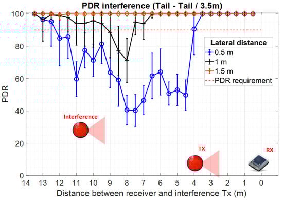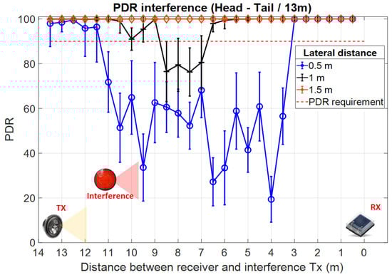The experimental results confirm several interesting points. First, one can see that for both experimental setups, interference do not affect link performances when the interference TX—receiver RX distance is of only a few meters. This can be attributed to the fact that in such cases, the limited VLC receiver FOV eliminates the TX signal to reach the VLC receiver photosensitive element. Next, as the distance increases, and the TX interference transmitter comes within the VLC receiver LoS, the PDR suddenly drops. As expected, the experimental results confirm that in such a case, the PDR is less affected when the V2V distance is shorter and thus, the SINR level is higher. This explains why the impact of the interference vehicle is so high in the second case (i.e., V2V distance of 13 m—Figure 14). As one can see, in these conditions, the PDR drops from values close to 100% to values around 20%, compared to a 50% PDR in the first case (i.e., V2V distance of 3.5 m—Figure 13). Following, as the distance between the TX interference transmitter and the RX receiver is increasing, the low PDR is initially maintained as the SINR level is maintained. In this case, the distance increase is compensated by the incidence angle decrease, resulting in a relatively similar SINR. Then, as the TX interference transmitter and the RX receiver distance continues to increase, the SINR increases and the PDR level gradually increases as well, re-entering in the targeted 90% limit. Therefore, these results confirm the simulation results illustrated in Figure 2 which link the PDR performances to the SINR level. Similar to simulation results, the experimental evaluation has shown that under intense interference exposure, the PDR decreases below the imposed 90% limit for almost the entire area. Exceptions to this rule are the cases when the interference are generated by vehicles located outside the VLC receiver FOV (i.e., at short distances and angles outside the VLC receiver FOV). On this topic, the experimental results also showed that the effect of interference gradually decreases as the lateral distance is increasing which is given by the fact that the optical power reaching the VLC receiver has an angular cosine dependency. This effect is highlighted when comparing the results of the 0.5 and 1 m lateral distance experiments. Nevertheless, in the case of the current experimental determinations, the high PDR observed for the 1.5 m lateral distance setup is mostly the result of relatively high directivity associated with the VLC interference transmitter. On the other hand, existing regulations do not provide clear standards for the vehicle stoplight systems. Therefore, as shown in [,,], the radiation pattern of existing vehicle stoplight systems can vary considerably. Additionally, the high PDR at 1.5 m lateral distance is the result of a relatively narrow FOV VLC receiver. Therefore, the experimental results have shown that from a PHY layer perspective, the effect of interference can be partially mitigated with the help of a narrow FOV. On the other hand, as this approach limits the mobility of the system, a context-adaptive approach based on an adjustable FOV receiver could be used, as suggested in [,]. In such a case, the VLC receiver could adapt the FOV in accordance with different factors, maximizing its performance.