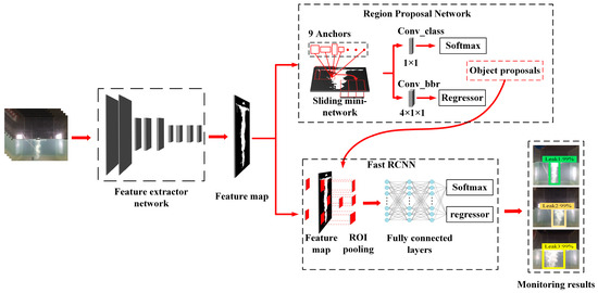 The development of a detection model based on the Faster R-CNN approach is to determine and fine-tune weights in all neural network layers by alternate training between the RPN module and the Fast R-CNN module. The RPN module is first trained under feature maps extracted by a pre-trained feature extractor network for producing the region proposal containing the object. Then, the Fast R-CNN module is trained by object region proposals generated by the trained RPN module to accurately detect the object classification and location. Lastly, fixing the shared convolutional layers and fine-tuning the unique convolutional layers creates two modules that share the same convolutional layers and form a unified network. The RPN and Fast R-CNN training are both based on region proposals or object classification and location. As such, the training loss function of the RPN and the Fast R-CNN is a multi-task loss function integrating the classification loss and regression loss. Equations (1) and (2) describe the loss function of the RPN module and the Fast R-CNN module, respectively.