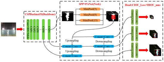 To improve detection accuracy and efficiency, YOLOv4 focuses on integrating and innovating some advanced tricks, which can significantly improve detection accuracy and almost had less impact on the detection speed. Among these, the backbone layer applies the new feature extractor CSPDarknet53 according to the Mish activation function [48] and Cross Stage Partial Network (CSPNet) [49], which can boost the feature extraction ability of the network. In the neck layer, the spatial pyramid pooling (SPP) [50] structure is introduced to capture local information of the extracted feature map by four times max pooling and then incorporate this information, which benefits the enhancement of the receptive field and so improves detection performance, especially for small targets. Meanwhile, this layer also applies a path aggregation network (PANet) [51] to fuse multiple scale feature information, which can increase the semantic feature and the location feature. Besides, to overcome incomplete expression between the bounding box and ground truth, the detection head layer performs CIOU loss [52], replacing IOU loss as the location regression loss function, which is shown in Equation (3):