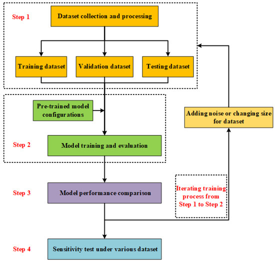 Step 4: We further conducted a sensitivity analysis for exploring the effect of noise intensity and image size on model monitoring performance, to determine the optimal developing dataset. Furthermore, we evaluated and compared the monitoring performance of the Faster R-CNN and YOLOv4 models developed by the optimal datasets. Finally, we determined the optimal model for monitoring underwater gas leakage.
