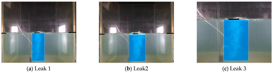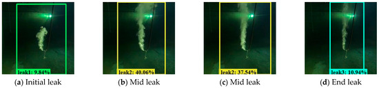 Next, we segmented the recorded videos into images that included the underwater gas plumes, and in total, achieved 8622 images, including 2000 images under 0.2 MPa, 3000 images under 0.4 MPa, and 3622 images under 0.6 MPa. Figure 5 displays the underwater gas leakage plumes under three leak pressures. As for these images, we further annotated the gas leakage plumes to produce annotation datasets that included classification labels and ground truth box positions. Figure 6 displays the annotation labels and ground truth boxes of the gas plume images under three leakage pressures. As can be seen, gas plumes of 0.2 MPa were labeled Leak1, gas plumes of 0.4 MPa were labeled Leak2, and gas plumes of 0.4 MPa were labeled Leak3. Meanwhile, the ground truth boxes covered the gas plumes, which were used as location information. Accordingly, both the experimental gas plume images and the annotation datasets were integrated as the developing datasets for the Faster R-CNN and YOLOv4 models.