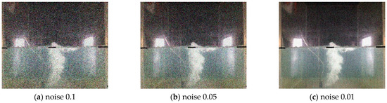 Furthermore, we processed the above images by adding Gaussian noises with intensities 0.01, 0.05, and 0.1 for achieving the developing datasets, respectively, and clipped image sizes of (720 × 720), (600 × 600), and (480 × 480) for achieving the developing datasets, respectively. Figure 7 displays images of the underwater gas plumes under three noise intensities, while Figure 8 displays images of the underwater gas plumes under three image sizes.