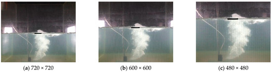 Figure 13 displays the recognition accuracy and inference time for Faster R-CNN model and the YOLOv4 model under image sizes for the Co. L. Mar. underwater gas leakage datasets. The recognition accuracy represented the model’s classification accuracy calculated by ROC-AUC. It can be seen that the AUC value for image size 720 × 720 was 0.93076 for the Faster R-CNN model, while that for image size 1280 × 720 was 0.99368. Meanwhile, the AUC value for image size 480 × 480 was at its maximum of 0.95863. Additionally, from this figure, it can be seen that as the image size decreased, the inference time of the Faster R-CNN model had a large increase. Accordingly, the image size 1280 × 720 was suitable for developing the Faster R-CNN model while the image size 480 × 480 was suitable for the YOLOv4 model.