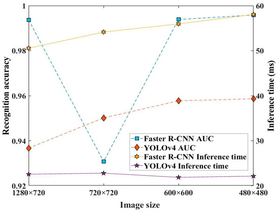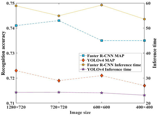Figure 11 displays the monitoring performance of the two approaches based on models developed under different image sizes experimental datasets. The recognition accuracy mAP value was calculated by MS COCO API. As can be seen, decreasing image size roughly resulted a reduction of the recognition accuracy mAP value. For example, the mAP value under image sizes 1280 × 720 and 720 × 720 was relatively higher than those of 600 × 600 and 480 × 480 for the Faster R-CNN model, and the mAP value of the YOLOv4 model under image size 1280 × 720 was maximum. Additionally, the inference time of the Faster R-CNN model fluctuated at 56 ms with the changing of image sizes, and that of the YOLOv4 model was about 23 ms, which was almost free from the image sizes. Accordingly, the large image size benefits the recognition accuracy of both the Faster R-CNN model and the YOLOv4 model.