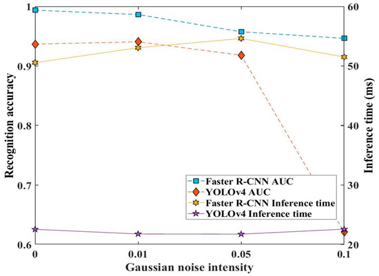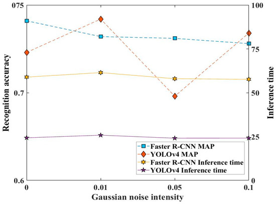 Figure 12 displays the monitoring performance of the two approaches under different noise intensities. It can be seen that the mAP value of the Faster R-CNN model declines with the increasing noise intensity, and that of YOLOv4 declines when 0.01 is at a maximum 0.742 and fluctuates at mAP value 0.742. Meanwhile, the inference times of the Faster R-CNN and YOLOv4 models were almost unaffected by noise intensities.