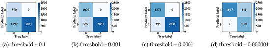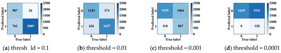 Confusion matrixes of the YOLOv4 models developed by the experimental dataset with image size 480 × 480 and noise intensity 0 under different pre-determined thresholds. Note that label 0 represents the existing gas leakage and label 1 represents no gas leakage. The predefined thresholds were determined according to the classification probability outputted by the YOLOv4 model.