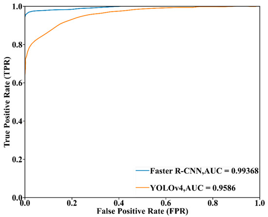 Comparison regarding ROC curve and AUC value between the Faster R-CNN model developed by the experimental dataset with image size 1280 × 720 and noise intensity 0, and the YOLOv4 model developed by the experimental dataset with image size 480 × 480 and noise intensity 0.