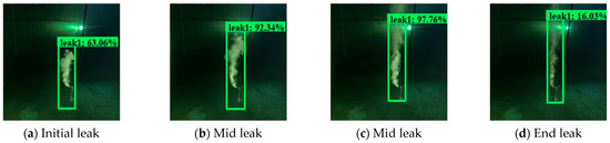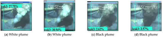 Figure 18 and Figure 19 display the visualization example of the Faster R-CNN model developed under image size 1280 × 720, while Figure 20 and Figure 21 display that of the YOLOv4 model developed under image size 480 × 480. As can be seen, the Faster R-CNN model was better than the YOLOv4 model in terms of classification and location for underwater gas plumes. On the one hand, the Faster R-CNN model classified the underwater gas plumes of the Co. L. Mar. datasets into Leak1 due to the small shape of the plumes, while the YOLOv4 model classified these plumes into Leak2. Meanwhile, the Faster R-CNN model provided a relatively higher classification probability than the YOLOv4 model, which indicated that the Faster R-CNN model was more confident for the small shape plumes of the Co. L. Mar. datasets. On the other hand, by observing the location box, it was found that although the Faster R-CNN model could not recognize the black plume seen in Figure 19, it could output a bounding box close to the area of the gas plume from real-world datasets, while the YOLOv4 model located no related areas in the monitoring datasets. This means that the Faster R-CNN model has better learning ability for features such as plume shape and color. Additionally, in terms of inference time, the Faster R-CNN model could keep a real-time monitoring speed of 56 ms/frame. Accordingly, the Faster R-CNN model developed by image size 1280 × 720 and no noise was optimal for monitoring underwater gas leakage.