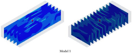 Flow analysis was performed to identify the flow velocity distribution of indoor air, and Figure 7 presents the flow velocity of air in cross-sections at 1 m intervals for nine models in the horizontal and vertical directions.