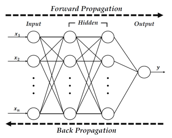 The neural network model used in this study is based on backpropagation. Backpropagation neural networks are algorithms that adjust the connection strength by propagating the errors from the output layer of the hierarchical neural network to the input layer [23]. Figure 1 shows the structure of the backpropagation neural network. A neural network consists of an input layer, several hidden layers, and output layers. Each node is fully connected, meaning each layer’s nodes are connected to all the nodes of the next layer. The initial value of the input layer in a backpropagation neural network passes through the intermediate layer composed of several layers, and finally, the output layer outputs the value. Furthermore, learning is conducted so that the connection strength between layers is adjusted inversely by comparing the output value with the previously provided correct answer value if an error is generated. Additionally, the learning is terminated if the error between the output and the correct answer becomes smaller than the allowable error during the learning process. A neural network model can be constructed based on the connection strength generated after training is completed [24]. A neural network model can be used as a classifier with many features and categories, such as LiDAR data because neural network learning is an end-to-end learning that can easily modify input and output size. For example, a linear classifier, SVM (Support Vector Machine), is limited to two categories. Additionally, rule-based classifiers or decision tree models are unsuitable for tasks with many features, such as LiDAR data, because users must specify constraints or rules for each feature [25].