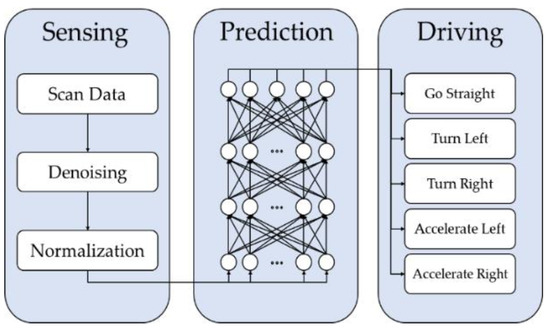 Figure 2 is a context diagram of the indoor autonomous driving system proposed in this paper. The autonomous driving vehicle uses the range data measured from the LiDAR sensor to determine a suitable driving command for the current state of the vehicle and moves by itself. As shown in the figure, the proposed system consists of three modules: Sensing, Prediction, and Driving. The Sensing module measures and processes LiDAR data and delivers it to the Prediction module. LiDAR data are measured through the middleware of the robot operating system (ROS), which allows data from various sensors to be used. ROS middleware supports the use of various sensors. The Prediction module uses a neural network to predict the driving commands that the autonomous driving vehicle should perform.