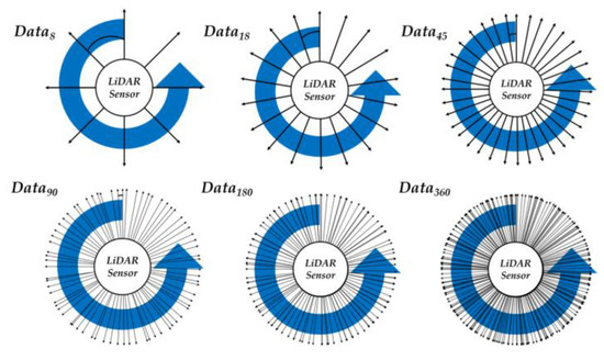 Furthermore, six learning models were created for performance evaluation according to the input size of the neural network. The measurement width of the data was adjusted and classified into six sets of range data for learning each model. Figure 3 shows the distribution LiDAR data. Equations (1)–(6) express the LiDAR dataset used in this study. Each dataset is represented by Datan, where n denotes the number of range data points constituting one dataset. Furthermore, each data point is distributed at regular intervals at 360°.