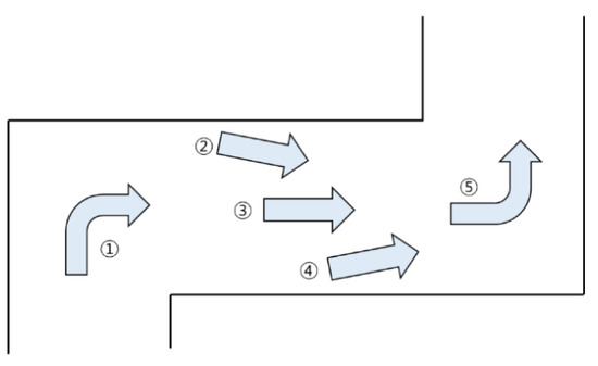Figure 4 depicts an example of driving commands that must be executed according to the location when driving in an indoor driving environment. There are five driving commands: ①—Turn Left, ②—Accelerate Left, ③—Go Straight, ④—Accelerate Right, and ⑤—Turn Right. The order is divided into situations where you have to go straight and those where you have to turn. In a straight environment, the center of the vehicle body is moved to the center of the driving path for stable driving without colliding with walls on the left and right or obstacles. The situation of driving straight is divided into three commands, ②, ③, and ④. Furthermore, the ③—Go Straight command is executed when the vehicle is located at the center of the passage. The ②— Accelerate Left command is executed when the vehicle body is biased to the left rather than the center. Conversely, if the vehicle body is biased to the right rather than the center, the ④— Accelerate Right command is executed. A junction is a point at which a vehicle can move in all directions according to a selected driving command. Additionally, the corner section determines the direction in which the vehicle can move. ①—Turn Left and ⑤—Turn Right commands are executed at junction points or corner sections. A driving command is executed along a path that can be driven in the corner section; however, the driving command may differ even at the same junction point.