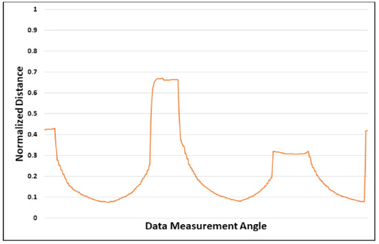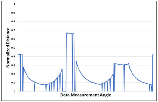 Equation (7) performs the function of filtering noise. If the range data are normally measured, the value is stored; if the value is 0, it is regarded as noise, and the value is predicted using adjacent data. Figure 5 shows the distribution of range data measured at a specific point. The x-axis of the graph represents the order of 360 data points from 0° to 359°, the point at which the data were measured. The y-axis of the graph represents the size of the normalized range data. Figure 6 shows the distribution of data with this noise removed. As mentioned previously, when noise is generated in the data, new data are created based on surrounding data to remove noise.