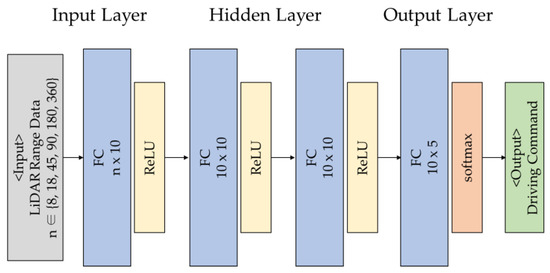 Figure 7 depicts the neural network model used in this study. The model determines the optimal driving command for the current situation based on the input LiDAR range data. The neural network model is in the form of a fully connected layer consisting of an input layer, a hidden layer, and an output layer. The output layer is classified into five driving commands. ReLU was used for the activation function of the middle layer, and Softmax was used for classifying driving commands in the output layer. The loss function of the model was cross-entropy. n in Figure 5 represents the size of the input. Furthermore, the size of the input corresponds to the six training datasets classified in Section 3.1. For example, the neural network learning model using Equation (1) data is “Model-8”. Furthermore, the model using the training data of Equation (2) is “Model-18.” “Model-45,” “Model-90,” “Model-180,” and “Model-360” correspond to Equations (3)–(6), respectively. The epochs of the neural network were set to 10,000 for performance evaluation in a limited environment. The learning rate of the model was derived by repeating the learning process. Furthermore, learning was most accurately completed in the limited epoch when the learning rate was set to 0.3.