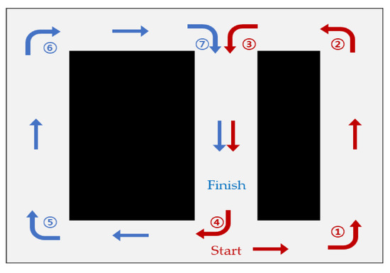 Figure 10 shows the data collection path in the circulation track based on the implementation track in Figure 9. The autonomous vehicle started from ‘Start,’ drove in order from ① to ⑦, and stopped at ‘Finish’. The LiDAR data collected during the driving process was stored, and the driving commands required at each location were labeled on the data collected at the corresponding location. Furthermore, 1100 datasets consisting of 360 range data were collected during the collection process. A total of 770 of the collected data were used for learning, and 330 were used for evaluation.