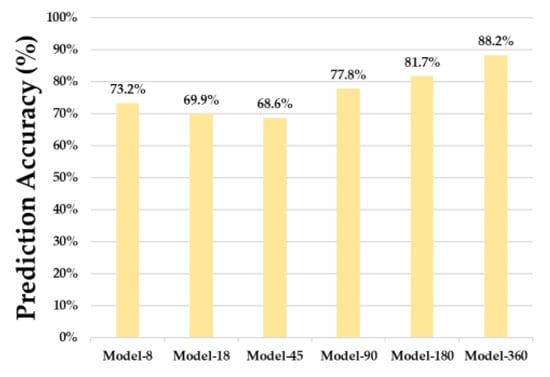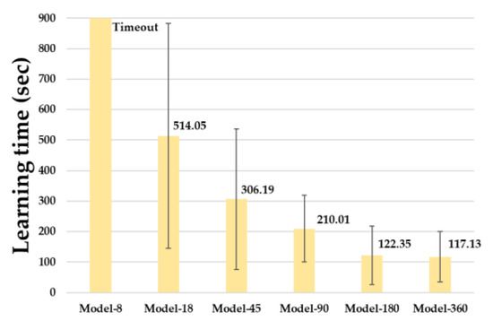 Figure 11 shows the time taken for each model to reach an accuracy of 0.95. Among the six learning models, Model-8 did not reach 0.95 accuracy until reaching the maximum epoch in the process of learning 10 times. Model-18 took 514.05 s and Model-45 took 306.19 s, and the average epochs of the two models were 49,856 and 29,696, respectively. The number of input data increased by 150% and the learning time decreased by 67.9% when the two models were compared. Model-90 achieved an accuracy of 0.95 over an average of 18,601 epochs in 210.01 s.