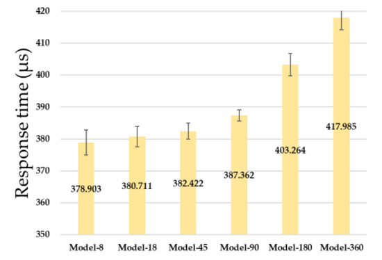 When an autonomous vehicle moves and interacts with surrounding objects in real space, physical collisions and malfunctions may occur in an unexpected situation if the response time is long. In this experiment, the response time was measured as the time taken to predict the driving command because of the discovery of surrounding objects while the autonomous vehicle was moving. Figure 12 shows the response times of the six neural network models. Data were entered 1,000,000 times for each model and compared using the average value, excluding the top 5% and bottom 5% of the response time. The response time increased as the number of inputs to the model increased. The response time of Model-8 was the fastest at 378.903 μs, and the response time of Model-360 was the slowest at 417.985 μs. Furthermore, the response time increased by 2% on average as the input size increased. As the size of the input increased, the number of calculations processed in the input layer of the neural network model more than doubled, resulting in a larger increase in response time.